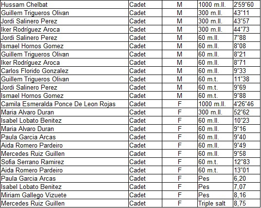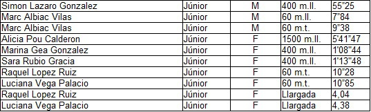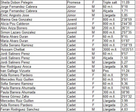 - Control cadet: 14 atletes del club (9 de l'Escola y 5 dels grups d'especialitat) amb moltes millors marques personals, on el Jordi Salinero va marcar un nou rècord del club cadet, dels 60 metres llisos, amb un crono de 7"88.
